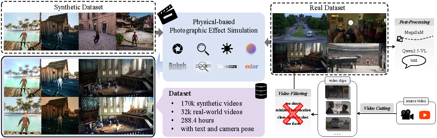 We generate training pairs by applying our proposed photographic effect simulator to both a synthetic dataset and a high-quality real-world dataset, which we curated from web and movie sources through a shot detection and filtering pipeline.