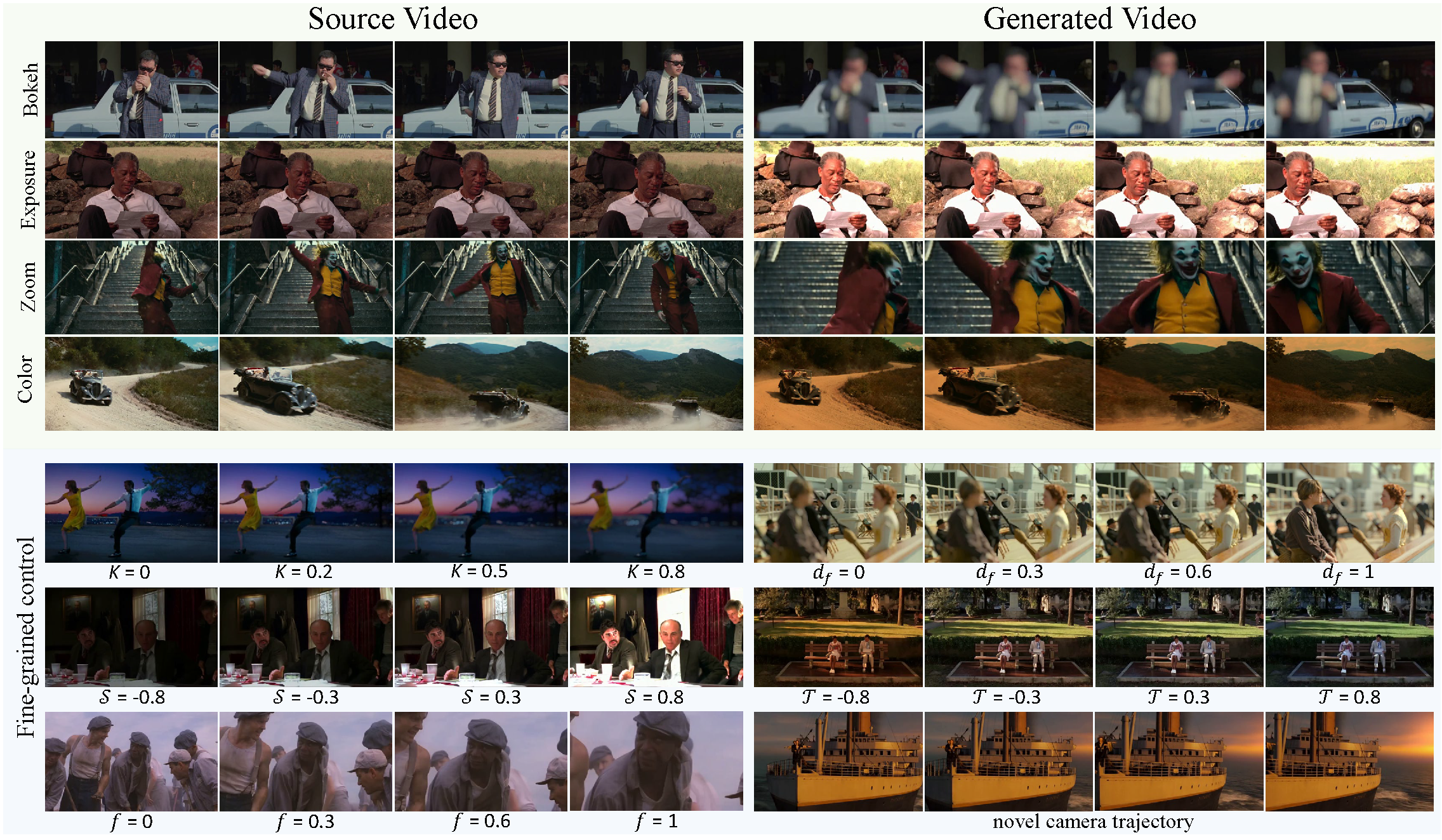 CineCtrl is the first video cinematic editing framework that provides fine control over professional camera parameters. We have five photographic effect parameters (Bokeh blur parameter, Refocused disparity, Focal length, Shutter speed, Color temperature) and one camera poses control parameter.