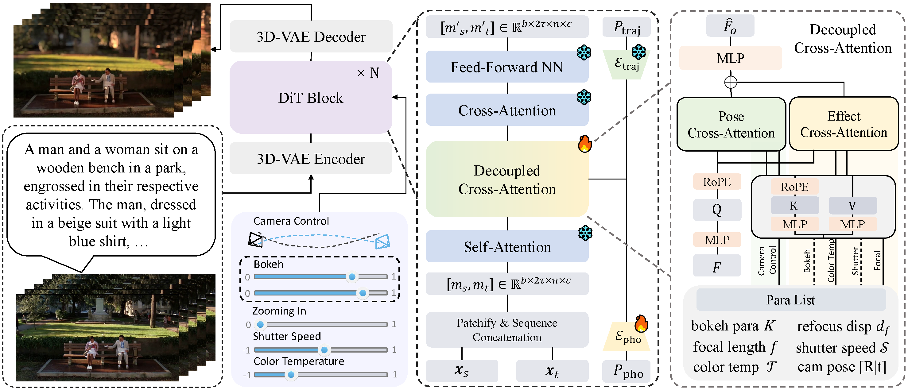 Overall framework of CineCtrl, which is built upon the Wan2.1 T2V framework, and extended to a V2V model. To enable camera control, we inject both camera trajectory and photographic parameter signals into the DiT block. Through our proposed Camera-Decoupled Cross-Attention mechanism, we disentangle these two signals to achieve accurate and independent control.